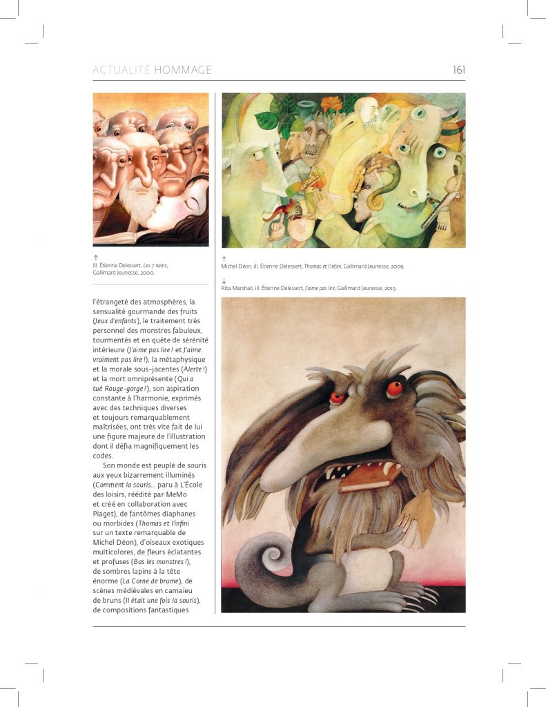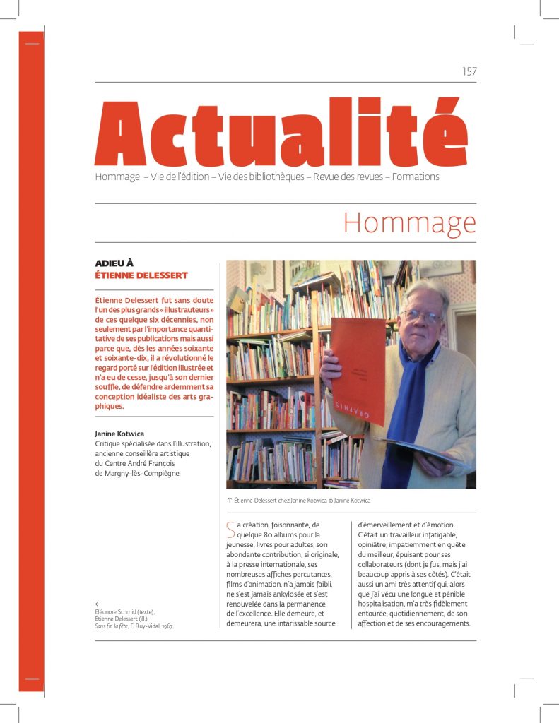 décennies, non seulement par l’importance quantitative de ses publications (quelque 80 albums pour la jeunesse, livres pour adultes, abondante contribution, si originale, à la presse internationale, nombreuses affiches percutantes, films d’animation…) mais aussi parce que, dès les années soixante et septante, il a révolutionné le regard porté sur l’édition illustrée et n’a eu de cesse, jusqu’à son dernier souffle, de défendre ardemment sa conception idéaliste des arts graphiques. Sa création, foisonnante, n’a jamais faibli, ne s’est jamais ankylosée et s’est renouvelée dans la permanence de l’excellence. Elle demeure, et demeurera, une intarissable source d’émerveillement et d’émotion. C’était un travailleur infatigable, opiniâtre, impatiemment en quête du meilleur, épuisant pour ses collaborateurs – dont je fus – mais j’ai beaucoup appris à ses côtés. C’était aussi un ami très attentif qui, alors que j’ai vécu une longue et pénible hospitalisation, m’a très fidèlement entourée, quotidiennement, de son affection et de ses encouragements.