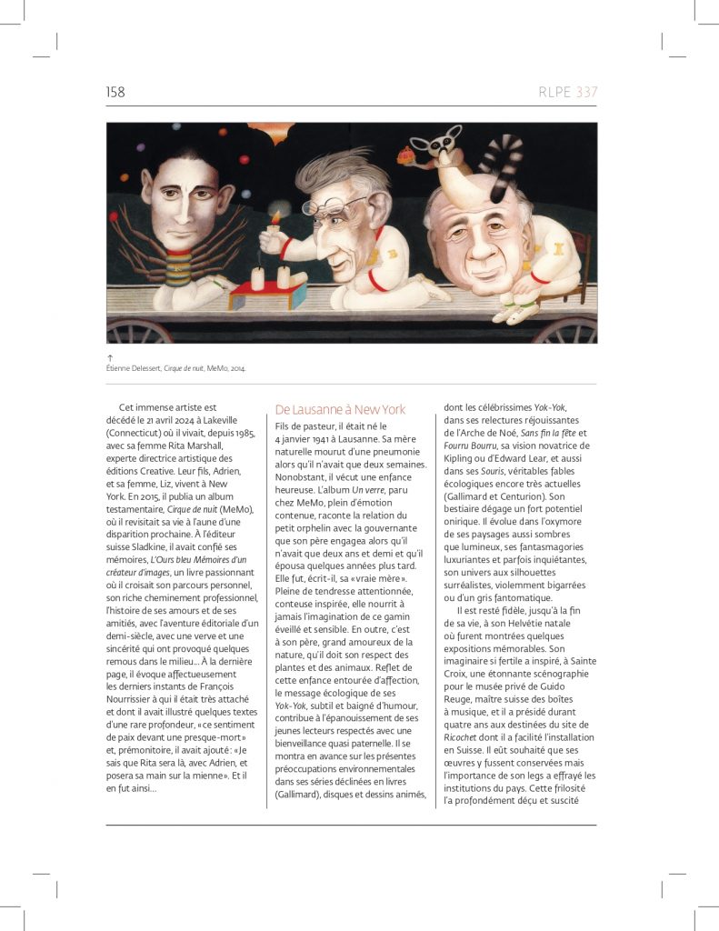Cet immense artiste est décédé le 21 avril 2024 à Lakeville (Connecticut) où il vivait, depuis 1985, avec sa femme Rita Marshall, experte directrice artistique des éditions Creative. Leur fils, Adrien, et sa femme, Liz, vivent à New York. En 2015, il publia un album testamentaire, Cirque de nuit, où il revisitait sa vie à l’aune d’une disparition prochaine (MeMo), et, à l’éditeur suisse Sladkine, il avait confié ses mémoires, L’Ours bleu Mémoires d’un créateur d’images, un livre passionnant où il croisait son parcours personnel, son riche cheminement professionnel, l’histoire de ses amours et de ses amitiés, avec l’aventure éditoriale d’un demi-siècle. Avec une verve et une sincérité qui ont provoqué quelques remous dans le milieu… A la dernière page, il évoque affectueusement les derniers instants de François Nourrissier à qui il était très attaché et dont il avait illustré quelques textes d’une rare profondeur, « ce sentiment de paix devant une presque-mort » et, prémonitoire, il avait ajouté : « Je sais que Rita sera là, avec Adrien, et posera sa main sur la mienne ». Et il en fut ainsi…