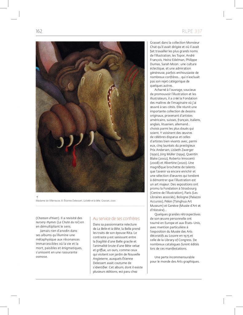 Dans sa passionnante relecture de La Belle et la Bête, la Belle prend les traits de son épouse Rita. Le contraste y est saisissant entre la fragilité d’une Belle gracile et l’animalité brute d’une Bête velue et griffue, un ours, comme ceux qui visitent son jardin de Nouvelle Angleterre auquels Étienne Delessert avait coutume de s’identifier. Cet album, dont il existe plusieurs éditions, est paru chez Grasset dans la collection Monsieur Chat qu’il avait dirigée et où il avait fait travailler les plus grands noms de l’illustration, les Topor, André François, Heinz Edelman, Philippe Dumas, Sarah Moon : une culture éclectique, et une admiration généreuse, parfois enthousiaste de nombreux confrères… qui n’excluaitt pas son rejet catégorique de quelques autres.