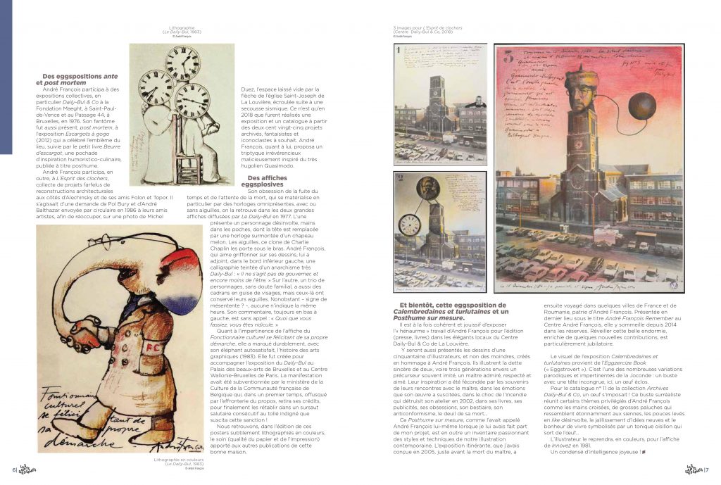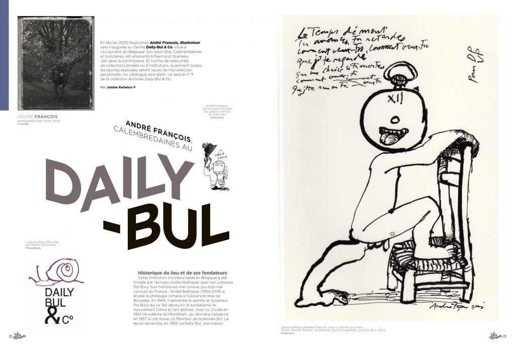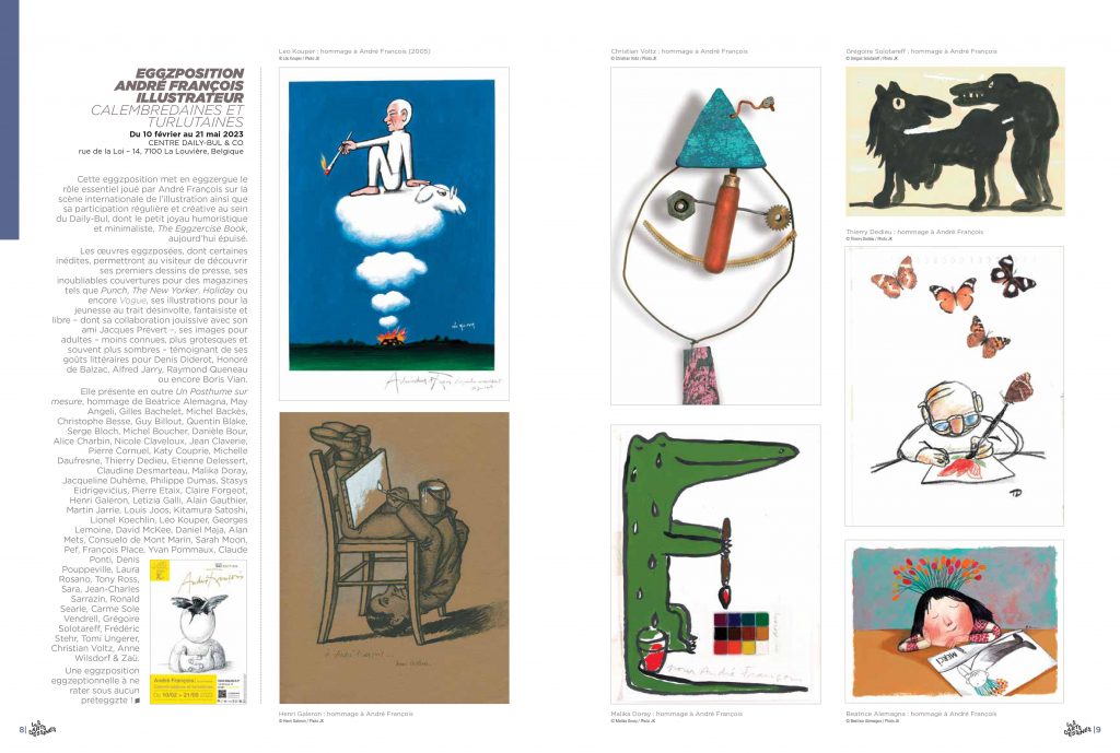 En février 2023 sera inaugurée une grande exposition consacrée à André François, illustrateur, au Centre d’art Daily Bul & Co, situé à La Louvière, en Belgique. Son sous-titre, Calembredaines et turlutaines, est emprunté à Raymond Queneau. J’en serai la commissaire. Et, hormis de rares prêts de collections privées ou d’institutions, quasiment toutes les œuvres exposées seront issues de ma collection personnelle. Un catalogue sera édité : ce sera le n°11 de la collection Archives Daily Bul & Co.