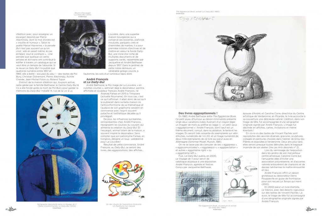 De plus, les influences surréalistes, omniprésentes chez André François, rejoignaient les sources du courant qui alimenta la création du Daily Bul. Et l’escargot, animal-totem de la maison, a souvent inspiré le dessinateur. Sans compter que son patronyme Farkas, en hongrois, désigne un loup : prédestiné pour La Louvière !