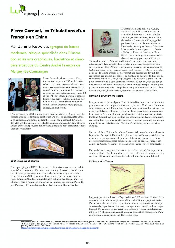 D’une part, Jinghe CHEN, libraire actif et bienfaisant, non seulement lui a organisé une exposition à Nanjing, mais, en plus, il a conçu et édité, à ses frais, Fleurs de poisson rouge, une histoire charmante écrite par sa collaboratrice Yulian YANG et, bien sûr, illustrée avec brio par notre cher ami Pierre Cornuel. Afin de souligner les liens culturels des deux nations, cet album est paru à Nankin en chinois, et en français, aux éditions Pierre-Papier-Pinceau (PPP) que dirige, à Paris, la dynamique Hélène Ran Li.