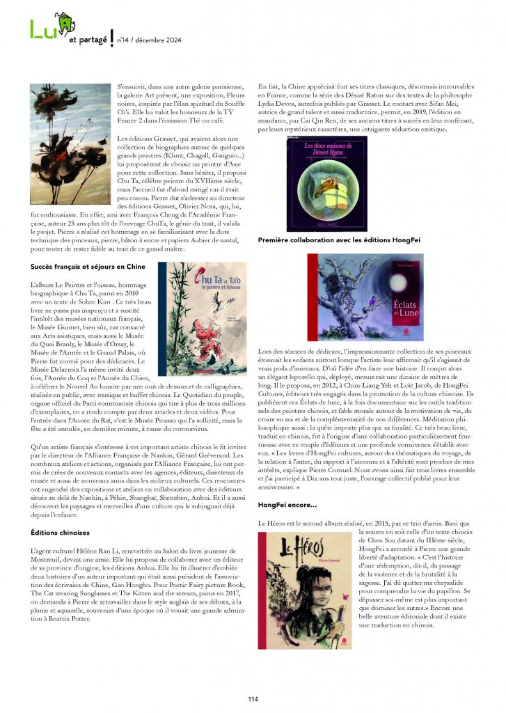 L’album Le Peintre et l’oiseau, hommage biographique à Chu Ta, parut en 2010 avec un texte de Sohee Kim . Ce très beau livre ne passa pas inaperçu et a suscité l’intérêt des musées nationaux français, le Musée Guimet, bien sûr, car consacré aux Arts asiatiques, mais aussi le Musée du Quai Branly, le Musée d’Orsay, le Musée de l’Armée et le Grand Palais, où Pierre fut convié pour des dédicaces. Le Musée Delacroix l’a même invité deux fois, l’Année du Coq et l’Année du Chien, à célébrer le Nouvel An lunaire par une nuit de dessins et de calligraphies, réalisés en public, avec musique et buffet chinois. Le Quotidien du peuple, organe officiel du Parti communiste chinois qui tire à plus de trois millions d’exemplaires, en a rendu compte par deux articles et deux vidéos. Pour l’entrée dans l’Année du Rat, c’est le Musée Picasso qui l’a sollicité, mais la fête a été annulée, en dernière minute, à cause du coronavirus.