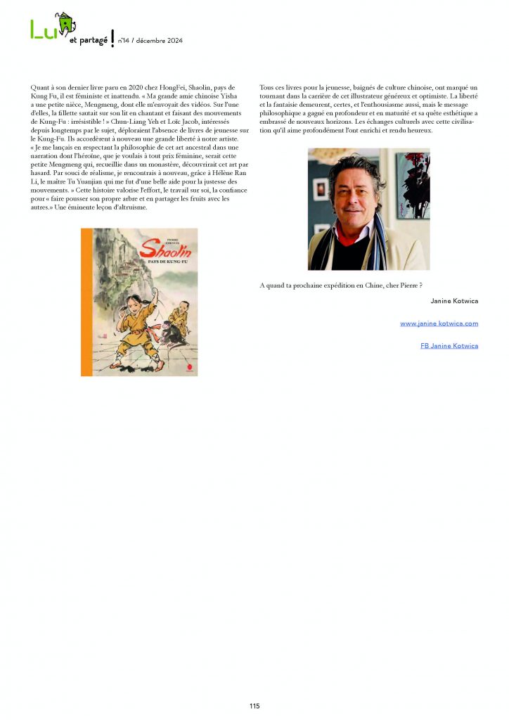 Quant à son dernier livre paru en 2020 chez HongFei, Shaolin, pays de Kung Fu, il est féministe et inattendu. « Ma grande amie chinoise Yisha a une petite nièce, Mengmeng, dont elle m’envoyait des vidéos. Sur l’une d’elles, la fillette sautait sur son lit en chantant et faisant des mouvements de Kung-Fu : irrésistible ! » Chun-Liang Yeh et Loïc Jacob, intéressés depuis longtemps par le sujet, déploraient l’absence de livres de jeunesse sur le Kung-Fu. Ils accordèrent à nouveau une grande liberté à notre artiste. « Je me lançais en respectant la philosophie de cet art ancestral dans une narration dont l’héroïne, que je voulais à tout prix féminine, serait cette petite Mengmeng qui, recueillie dans un monastère, découvrirait cet art par hasard. Par souci de réalisme, je rencontrais à nouveau, grâce à Hélène Ran Li, le maitre Tu Yuanjian qui me fut d’une belle aide pour la justesse des mouvements. » Cette histoire valorise l’effort, le travail sur soi, la confiance pour « faire pousser son propre arbre et en partager les fruits avec les autres.» Une éminente leçon d’altruisme.